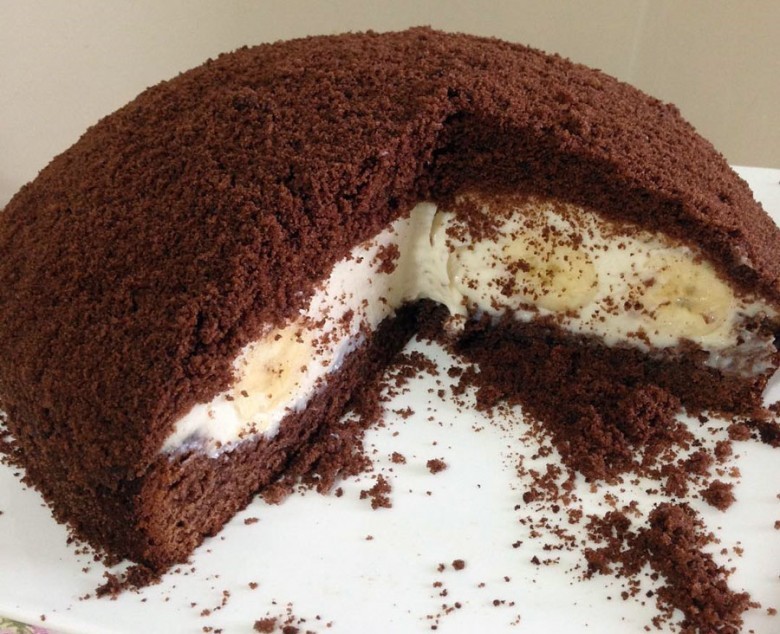Muzları doğrayın ve içini oyduğunuz kekin orta kısmına yerleştirin. Önceden hazırladığınız ılınan krema ile pastanın üzerini tamamen kapatacak şekilde orta kısmından başlayarak sıvayın.